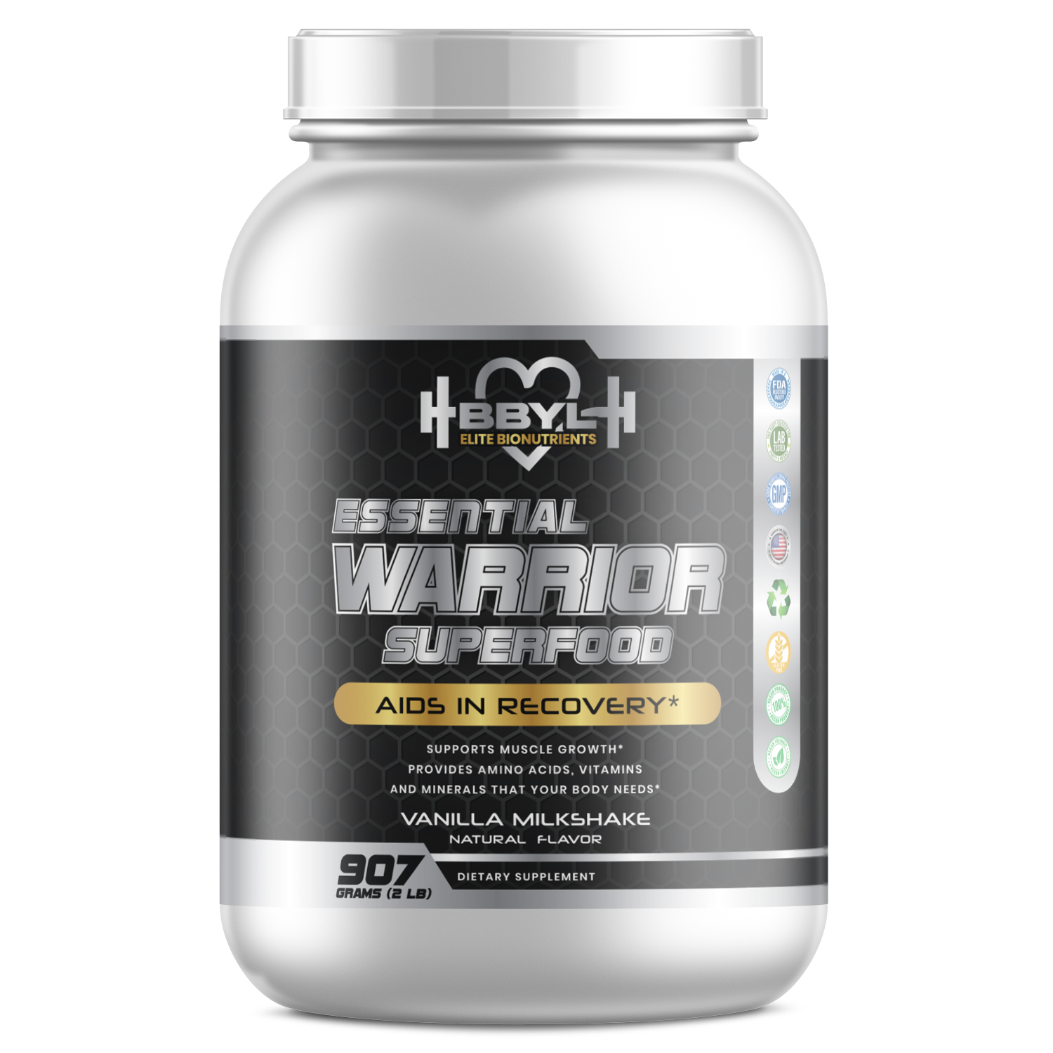 Essential Warrior Superfood is formulated to support muscle growth, immunity, digestive health, increase satiety, increase fat burning, and boost metabolic rate. Our product is synthesized utilizing the latest scientific research and formulated with high quality ingredients. Our formula provides a plant-based source of protein that contains all the essential and branched-chain amino acids with an amino acid profile similar to whey protein. Our Vegan protein contains a super fruit antioxidant blend in a delicious vanilla flavor! Our formula is third party independently tested for heavy metals, impurities, made in the USA, GMP certified, and produced in an FDA registered facility. 1% of the supplements on the market can match our world class standards. |