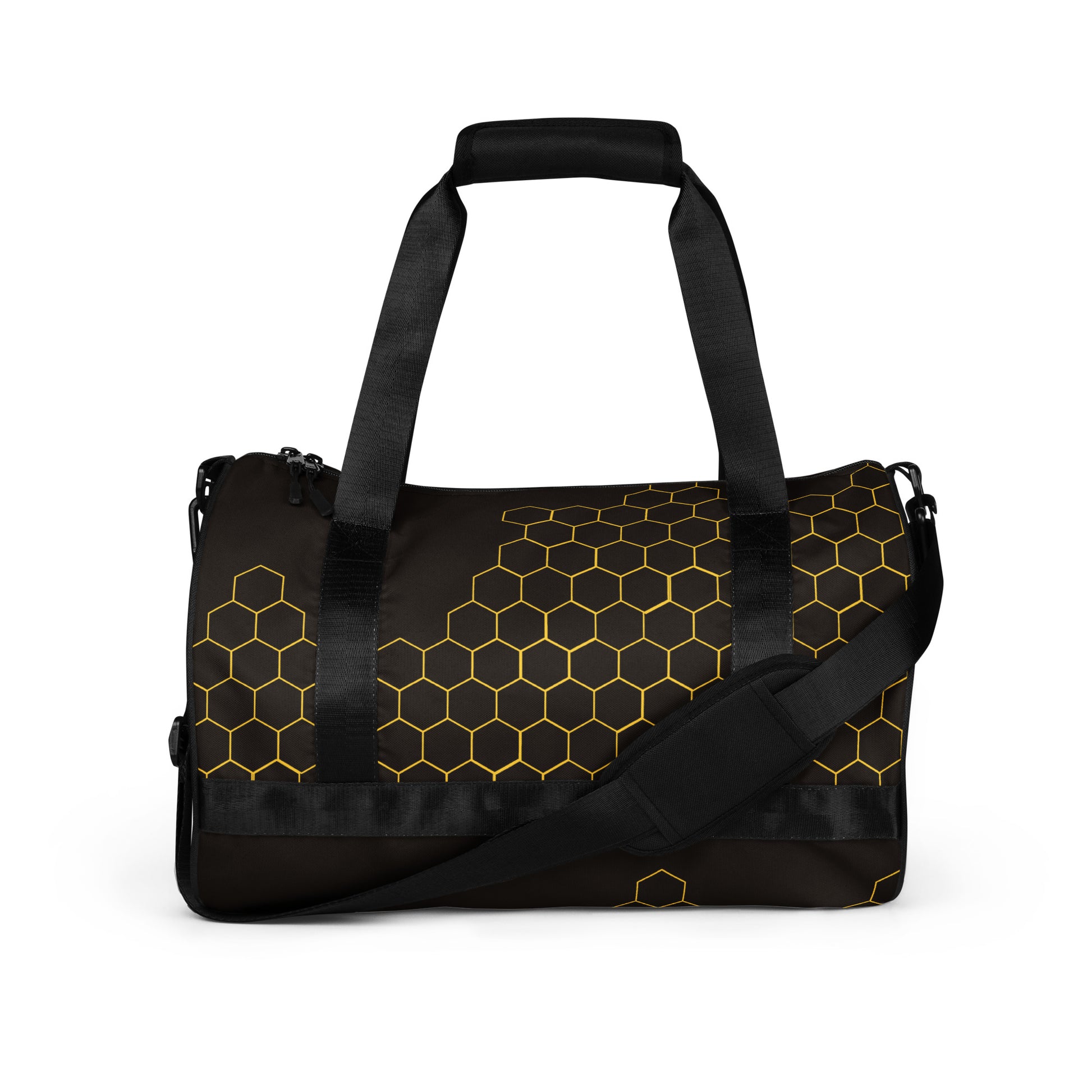 Ready to get your fitness on? Add some punch to pumping iron with this all-over print gym bag. Made from 100% polyester and sturdy, water-resistant fabric, this bag is fun meets function. And it’s got pockets!